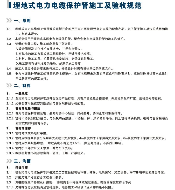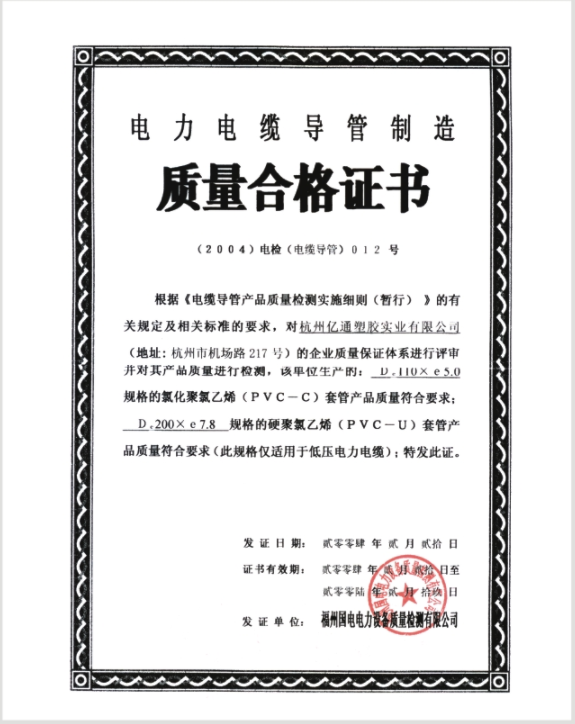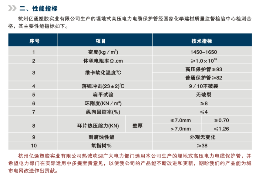 埋地電(diàn)力(lì)電纜保護用氯化聚(jù)氯乙烯管材,主要用於電力電纜敷設並起導向(xiàng)和保護電(diàn)力電(diàn)纜作用,產品采用擴ロ承插,連(lián)接處采用(yòng)耐高溫橡膠圈(quān)密封,可以防止熱漲冷縮的影響(xiǎng);施工中一般情況下無需在施工現場澆搗混凝士及保障(zhàng)層;自重輕,施工方便、運輸及施工費用低,土方(fāng)開挖(wā)量小,可以大大縮短工期。特別是該產品經過改性後,其“維(wéi)卡軟(ruǎn)化點”溫度可(kě)提高93℃以(yǐ)上(shàng),比普通PVC-U管材維卡軟化(huà)點溫度78℃有了大大提高,用於埋地電(diàn)力電纜(lǎn)保護管,即使管內電纜發生過載或(huò)短路,所產生的溫度對產品也無任何影響。經模擬試驗,電纜(lǎn)芯線溫度連續15天為100~C時,埋地管材管壁(bì)溫度為(wéi)80℃,處於熱平衡狀態,不發生變形(xíng)。目前國外日本等發達國家已大量(liàng)采用PVC改性管材取代石棉水泥管。國內許多重點工程(chéng)也已推廣采用PVC-C改性電纜管用於電纜敷設。